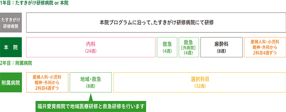 このプログラムの最大の特徴は、2年次必修科目の救急・地域医療の2ヶ月間を福井愛育病院で研修できる点です。福井愛育病院は小児科と産婦人科のみの病院で、小児科のみで49床(一般小児37床、NICU12床)、年間約1200件の分娩を扱っています。外来患者さんや新生児症例も多く、初期研修のうちから様々な経験を積めると考え、当プログラムを志望しました。 -
