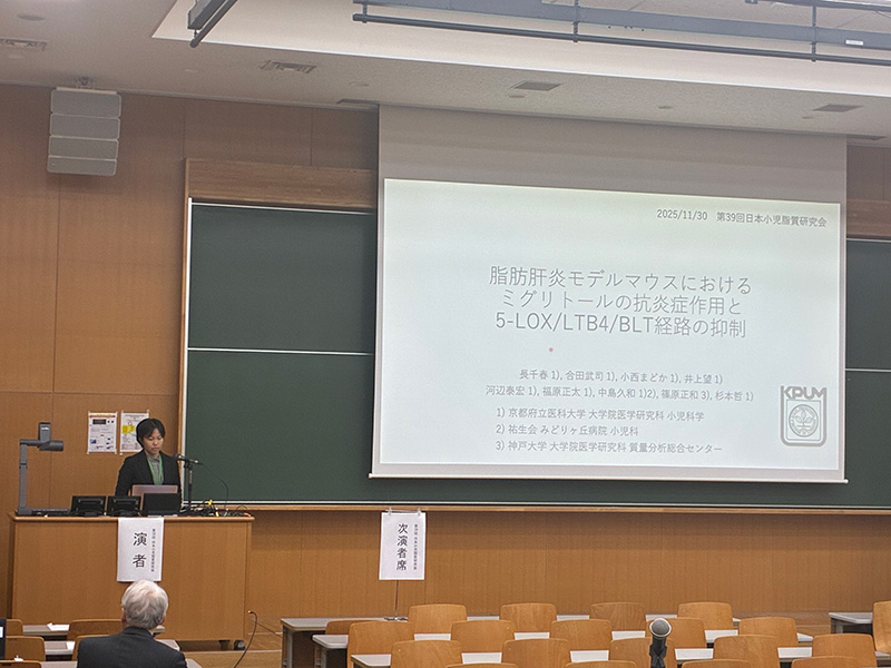 若手優秀演題賞の受賞 第39回 日本小児脂質研究会(令和7年11月29・30日、千葉県市川市開催、学会長:原 光彦先生)において、当教室大学院生・長 千春先生の演題「脂肪肝炎モデルマウスにおけるミグリトールの抗炎症作用と 5-LOX/LTB4/BLT 経路の抑制」が若手優秀演題賞を受賞しました。