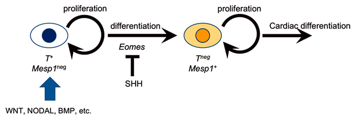 basic HLH転写因子Mesp1を発現する心臓中胚葉細胞において、その分化の最も早い段階は転写因子TおよびT-box転写因子Eomesによって制御されている。特にEomesはMesp1を直接誘導することが知られており、心筋分化において不可欠である。マウス胚では、Mesp1を発現する心臓中胚葉細胞が胚の前方に遊走しNkx2-5, Isl1, Gata4, およびTbx5といった遺伝子の発現によって特徴づけられる、心臓前駆細胞としての特質を獲得する。